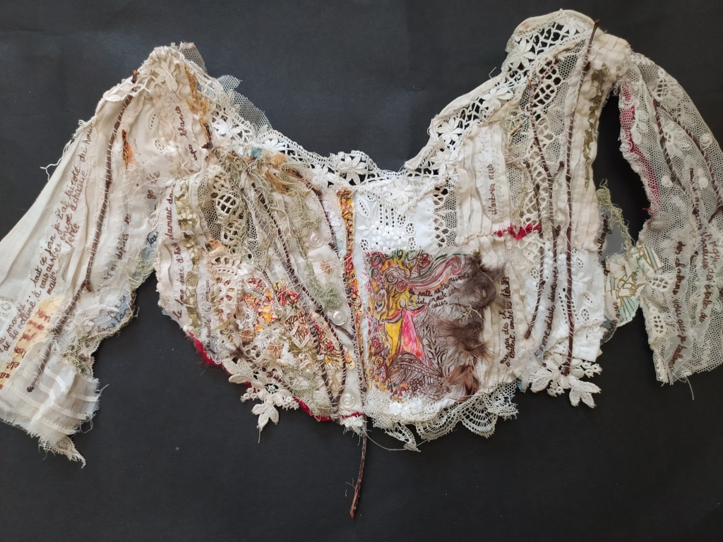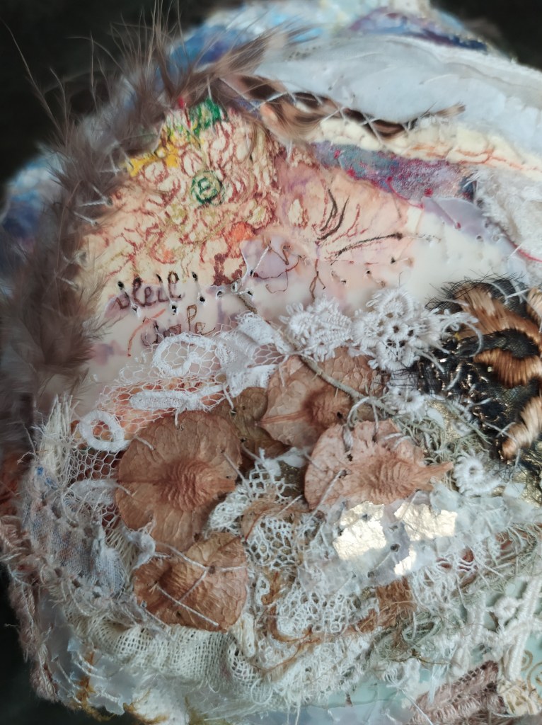 Je continue à coudre ce qui ne se coud pas ; les mousses, les branches et le calque, les rubans, les plumes et les dentelles, les mots et les papiers deviennent maintenant chapeau et petite chemise de fée…