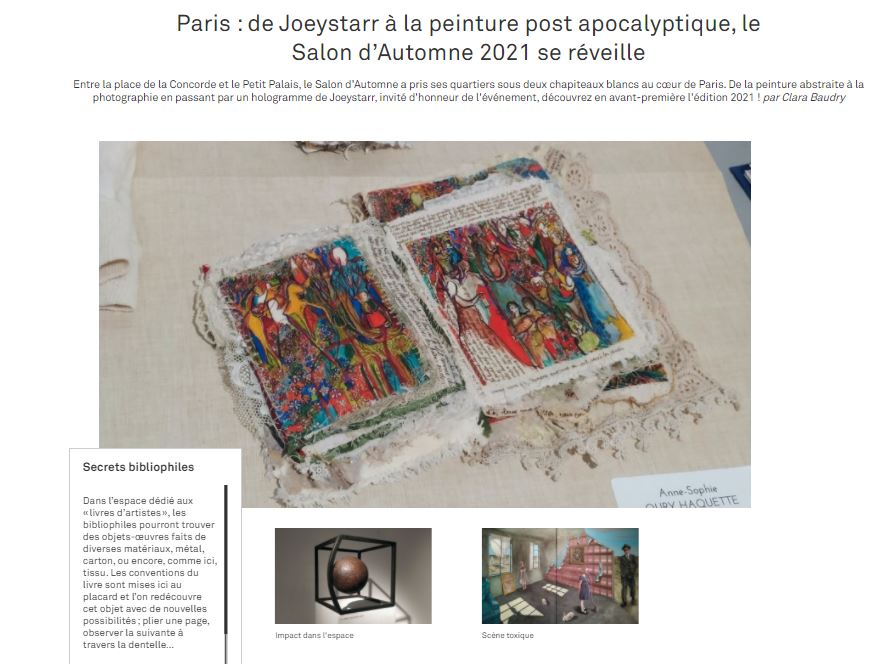 Je suis très heureuse de partager avec vous cet article et ce prix. Merci à » Connaissance des arts », à Clara Baudry, aux Amis du Salon d’Automne, à Michel Boucaut sans qui je n’aurais pas participé à ce magnifique Salon d’Automne.