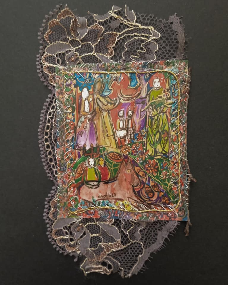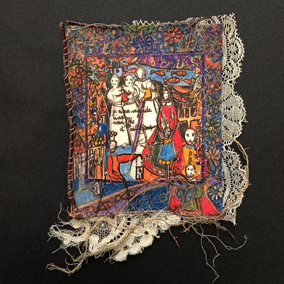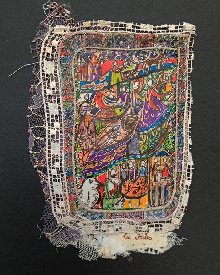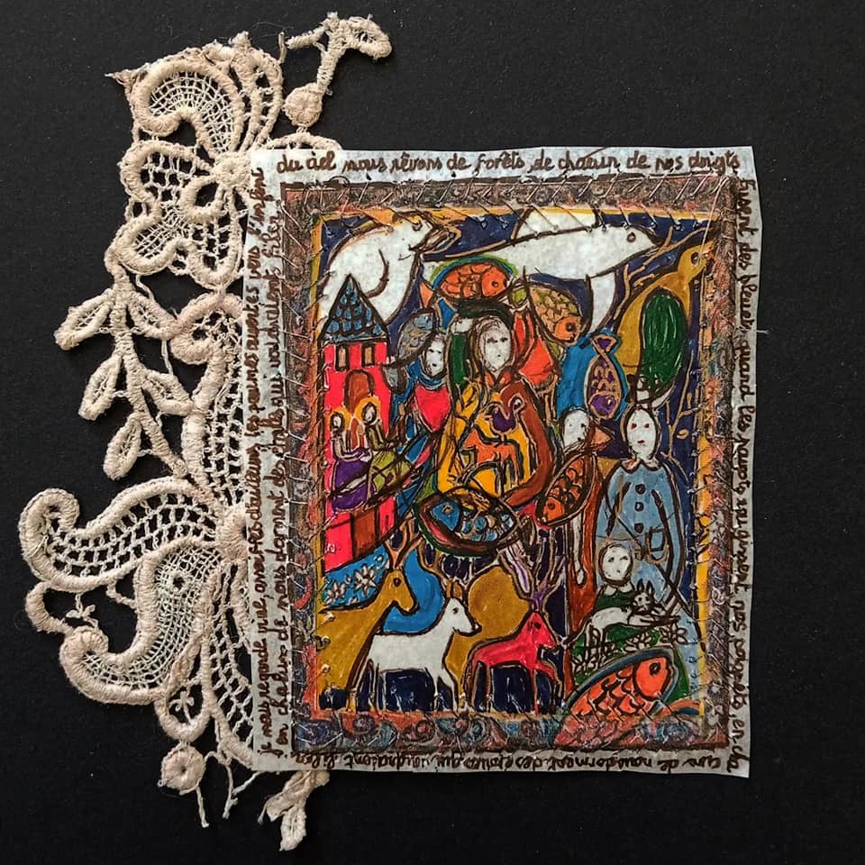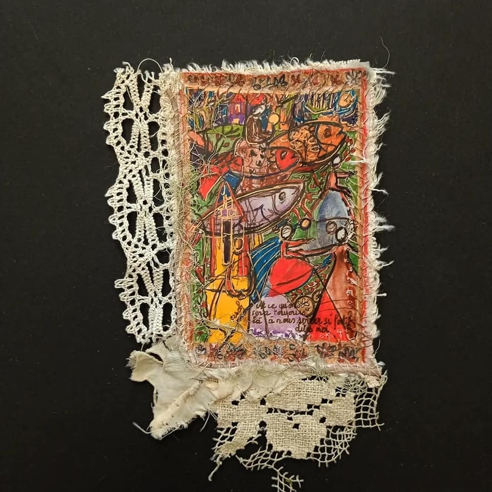 Dessin et texte aux feutres à encre, fragments cousus.